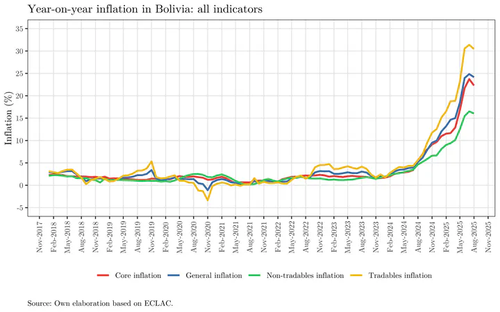 This post showed how to extract data from ECLAC using its API and, as a practical case, analyzed the evolution of inflation in Bolivia and its comparison with other countries in the region. It was observed that inflation in Bolivia has been significantly higher than in other countries in the region, and that both tradable and non-tradable goods have experienced price increases, although non-tradables took a little longer to rise.