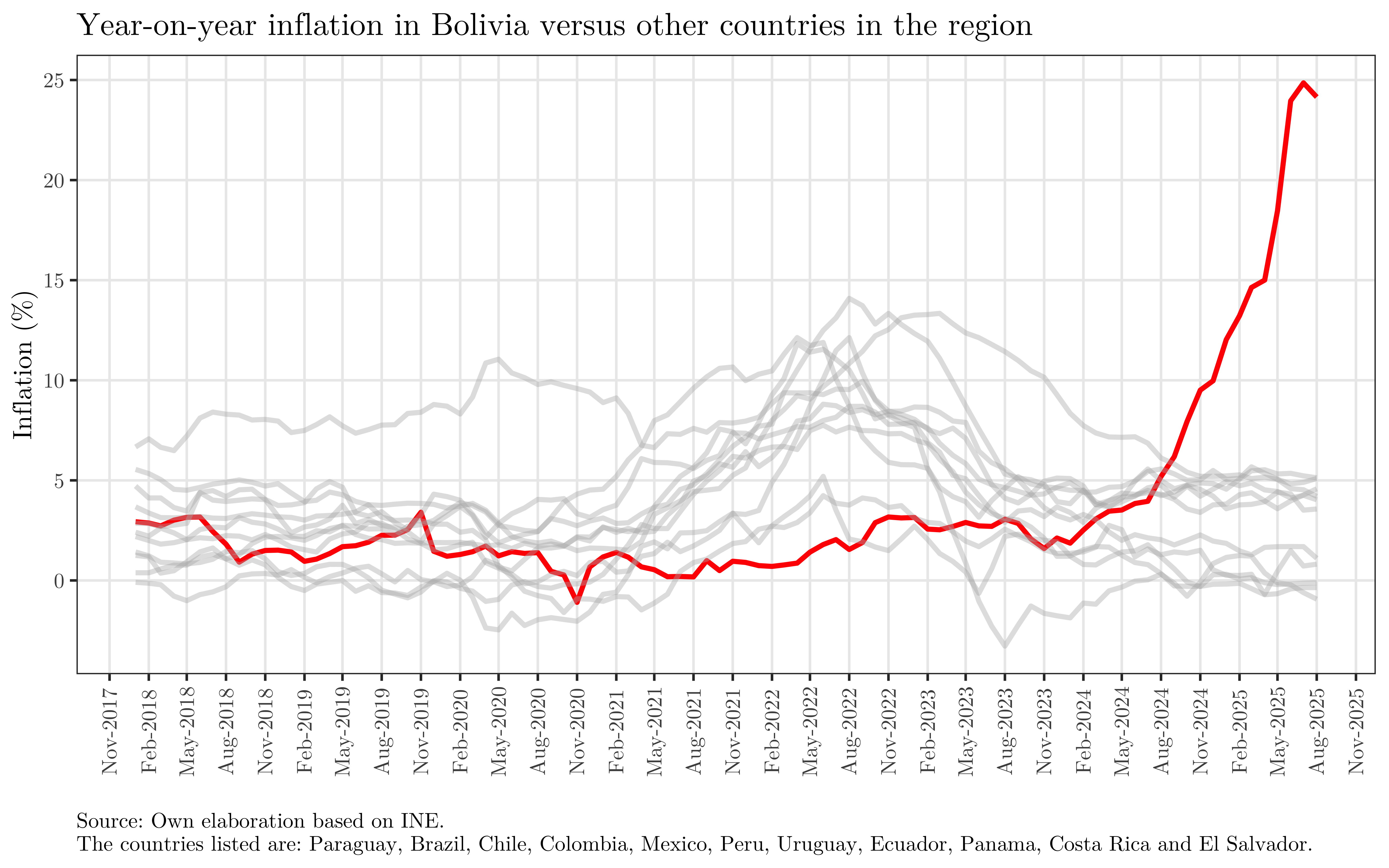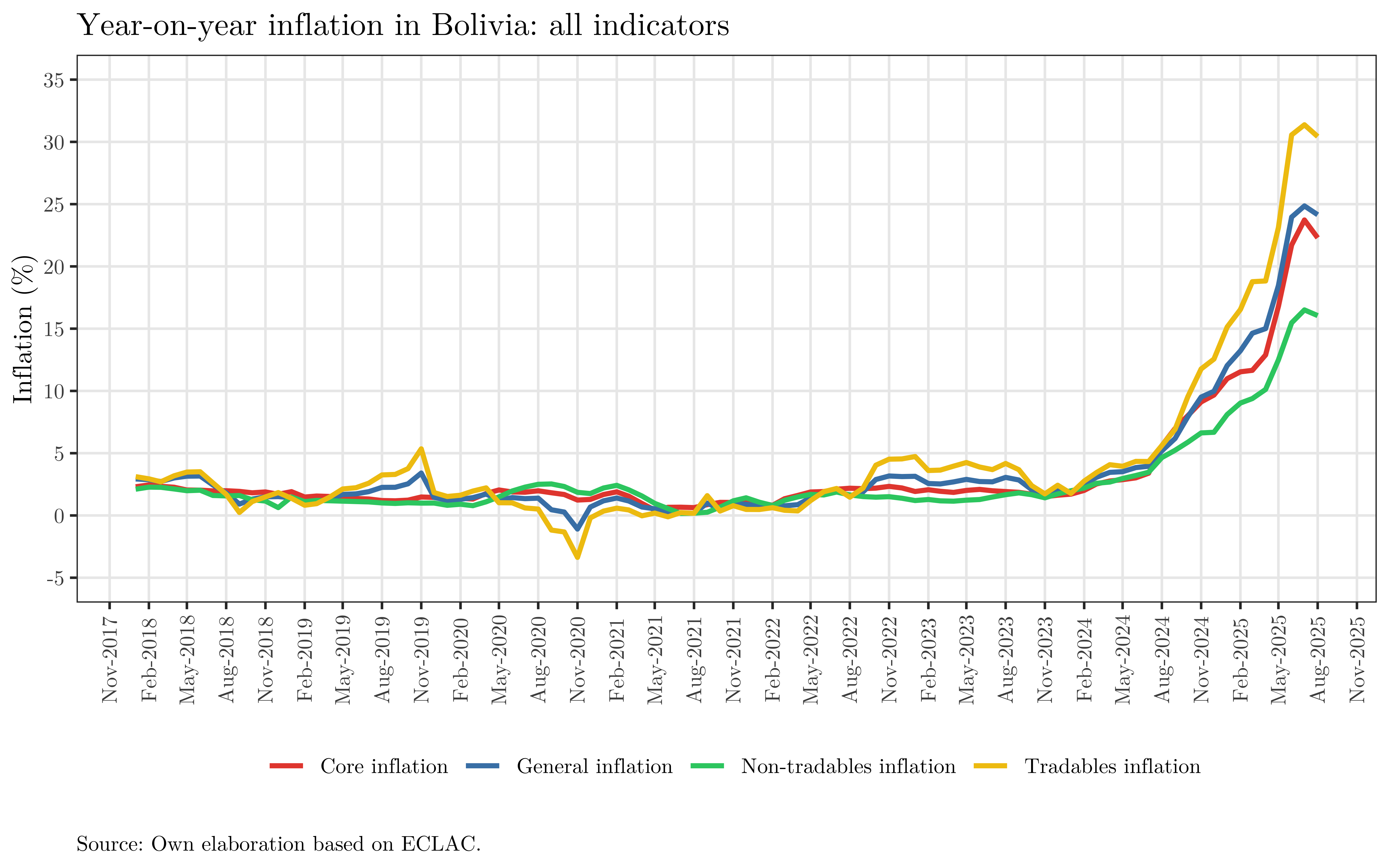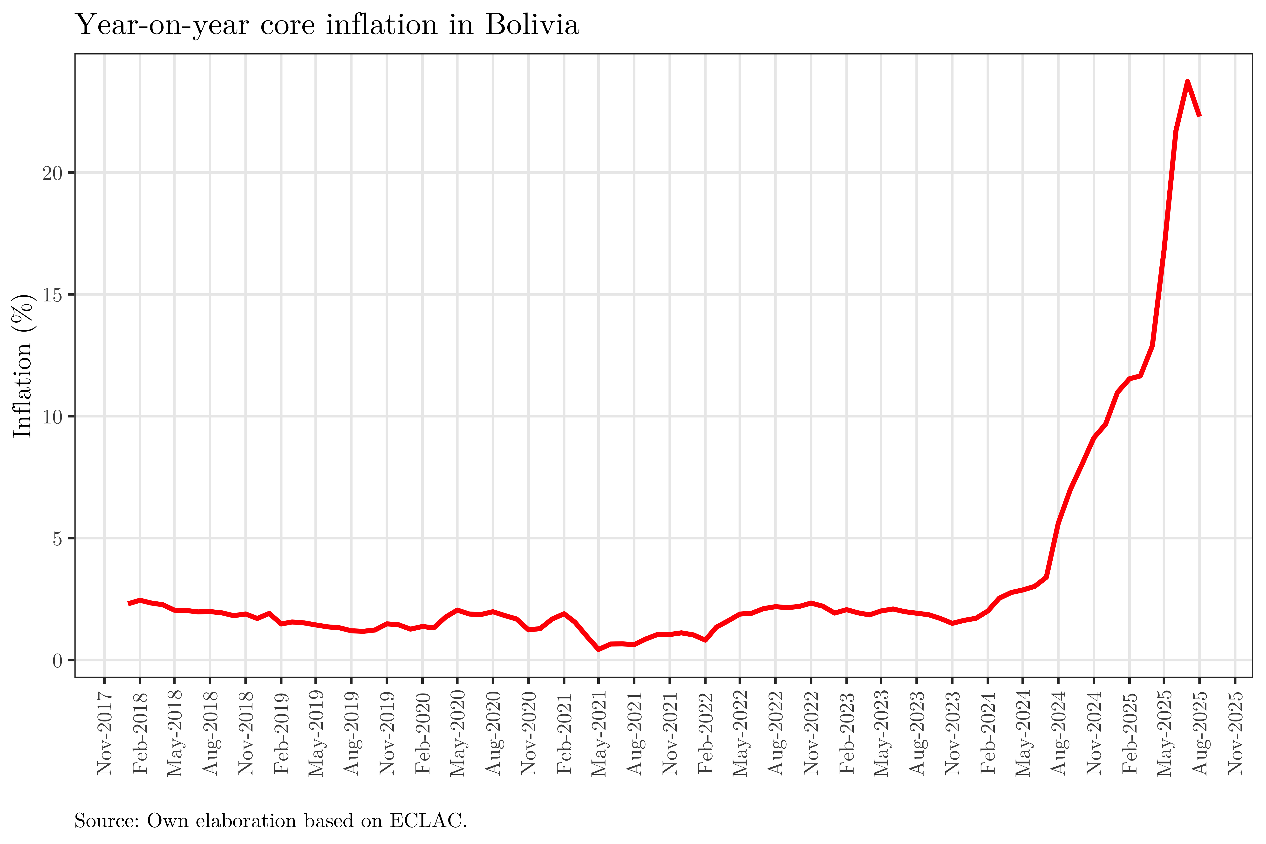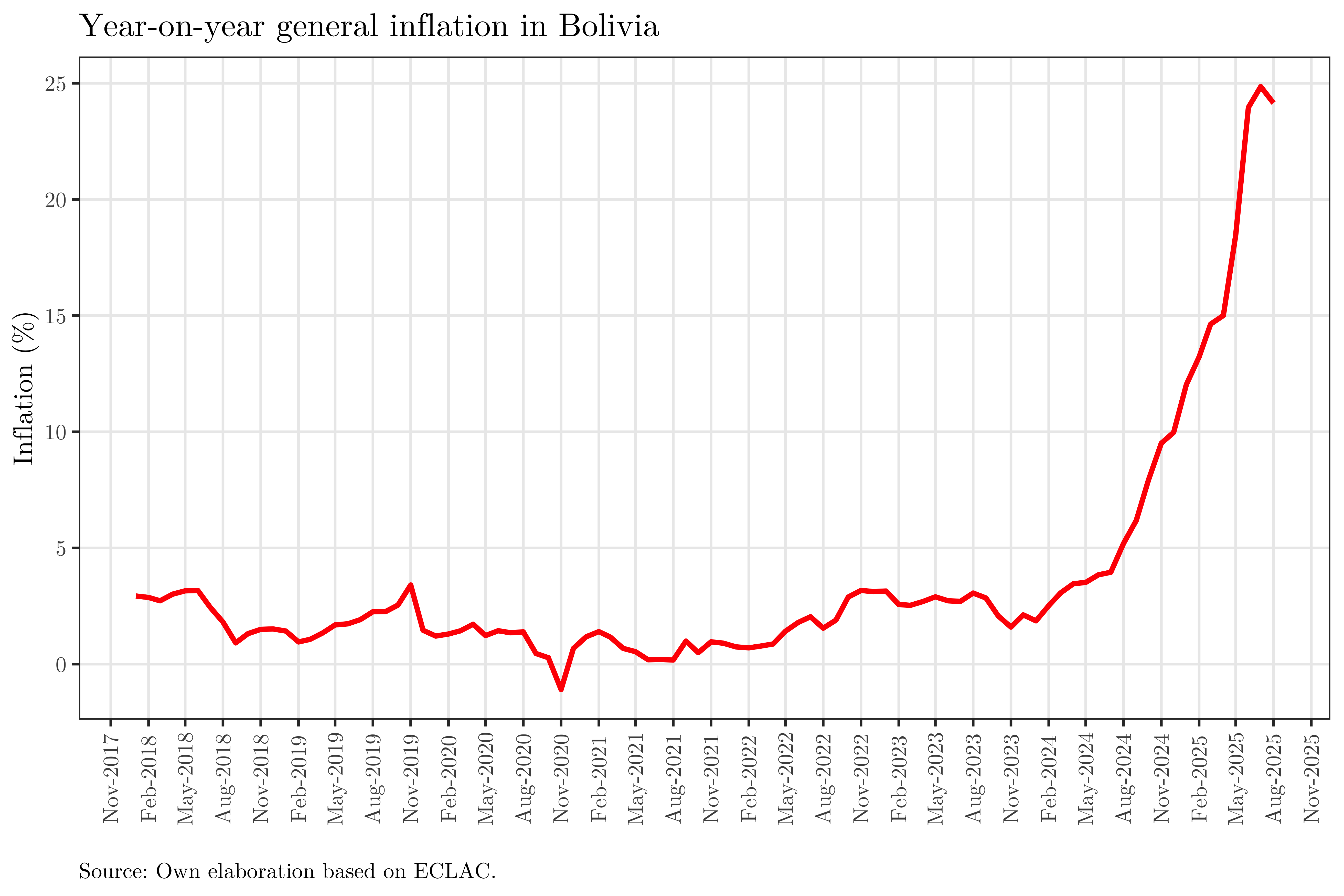 For the past few months, the Bolivian economic situation has been in constant deterioration: sustained fiscal deficit, depletion of international reserves, and the consequent breakdown of the fixed exchange rate, among others. One of the indicators where the problem has manifested is inflation which, as will be seen below, has been rising considerably.