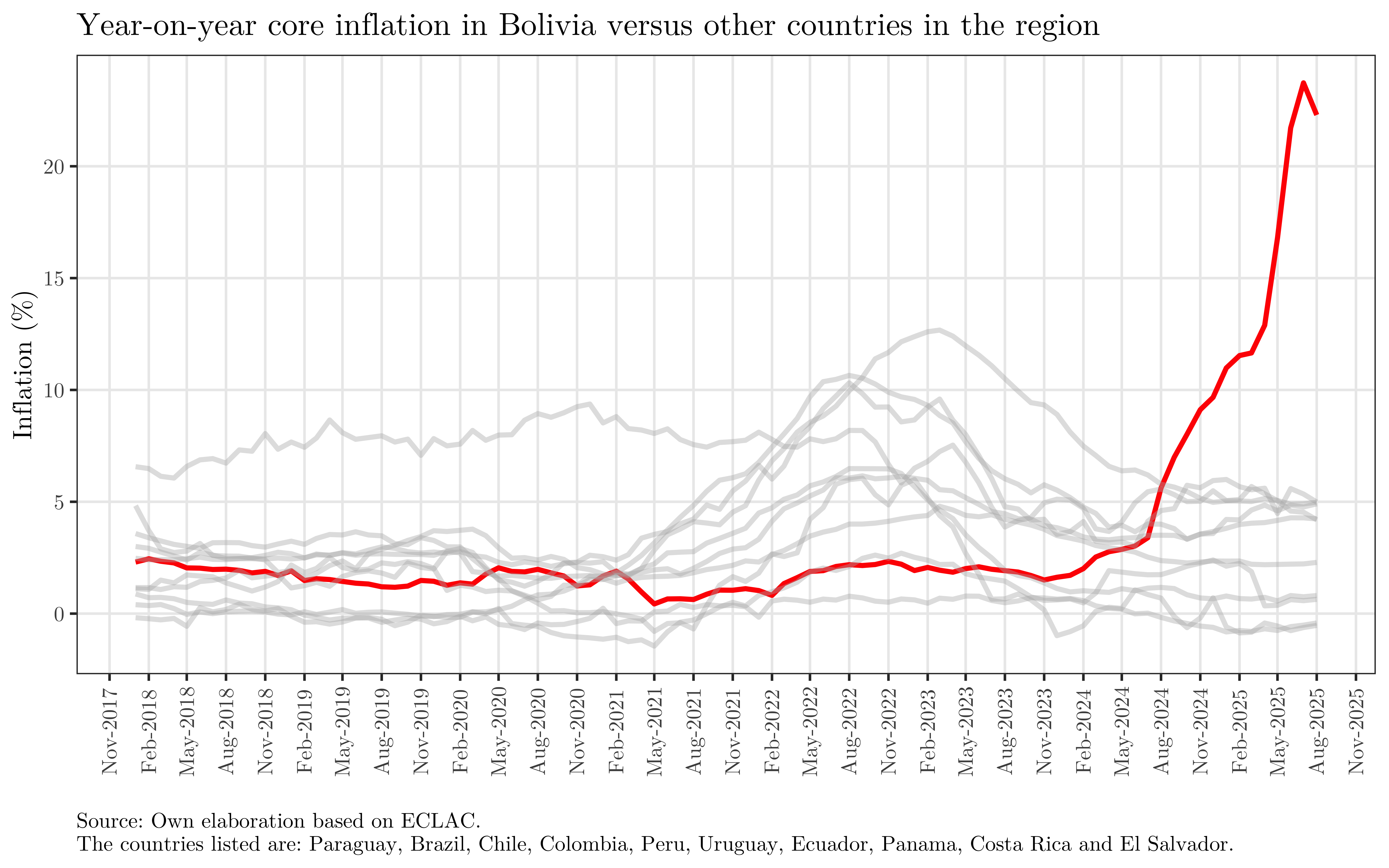 labs(title = "Year-on-year core inflation in Bolivia versus other countries in the region",