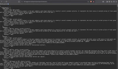 To understand the idea of an endpoint, simply paste the following URL into your preferred web browser https://www.imf.org/external/datamapper/api/v1/indicators. This will return plain text in JSON format with the list of available indicators: