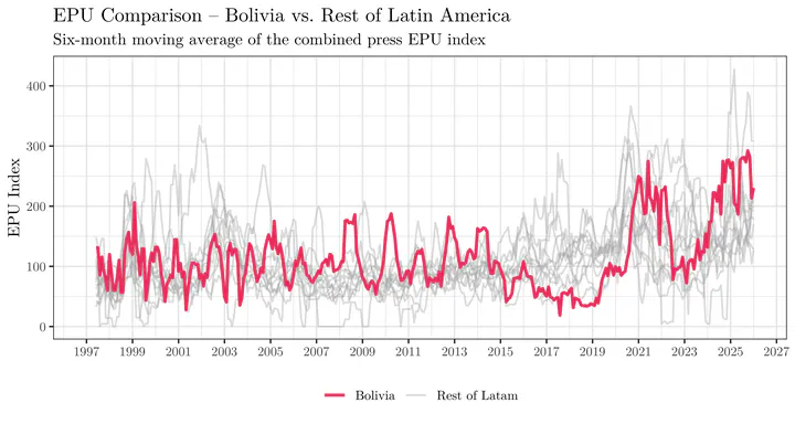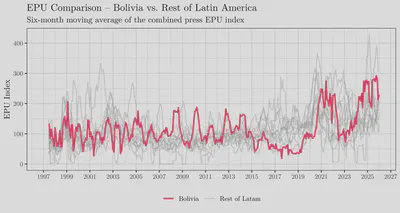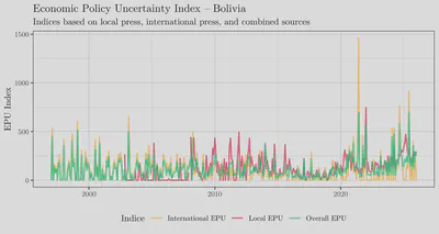 A few days ago, a LinkedIn post by Javier Perez from the Bank of Spain caught my attention. It announced the publication of Economic Policy Uncertainty (EPU) indices for several Latin American countries, including Bolivia. The index is developed in Andres-Escayola et al. (2025).