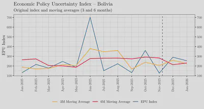It can be observed that since late 2022, economic policy uncertainty in Bolivia has shown an upward trend, with a brief moderation in early 2025. This pattern becomes clearer when looking at the moving average.